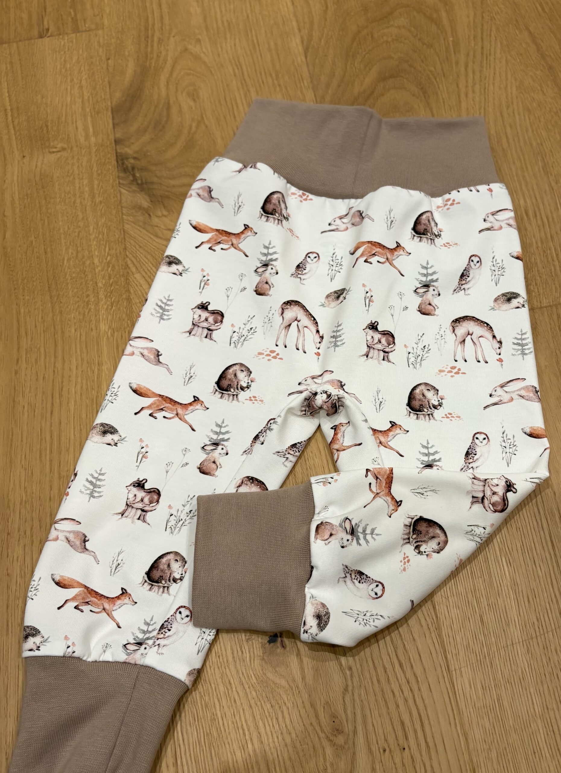 Die Pumphose Waldtiere zart | Baby vernäht ist eine gemütliche Hose die ein paar Größen hinweg mitwächst.